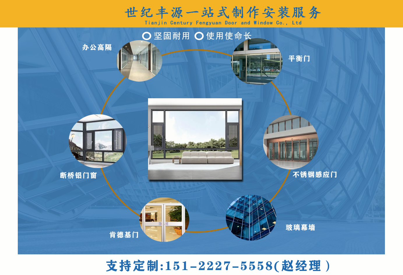 天津世紀豐源門窗有限公司從事斷橋鋁門窗,玻璃幕墻,平衡門,肯德基門,不銹鋼感應門,百葉窗,辦公高隔,制作安裝一站式訂制生產及配套服務等?! 」咀猿闪⒁詠?,始終堅持以人才為本、誠信立業(yè)的經營原則,薈萃業(yè)界精英,成熟的技術、管理方法及企業(yè)經驗與國內企業(yè)的具體實際相結合,為企業(yè)供給各個方面的解決方案,使企業(yè)在激烈的市場競爭中始終堅持競爭力,實現企業(yè)快速、穩(wěn)定地發(fā)展。 質量好、服務好、才能信譽好,公司已在諸多領域取得輝煌成績,愿意成為您可信賴的長期合作伙伴。 讓我們攜手同行,共同實現“讓普通老百姓都用得上高端門窗”...